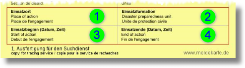 Im Einsatzfall musst Du auf den ausgedruckten Karten nur noch den Einsatzort, die Einsatzformation und den Einsatzbeginn vermerken. Das sind die Felder in der roten Umrandung. Dann gibst Du Deine gelbe Karte und die Karte mit dem gelben Strich bei Deinem SEG-Führer ab. Die weiße Karte behältst Du!